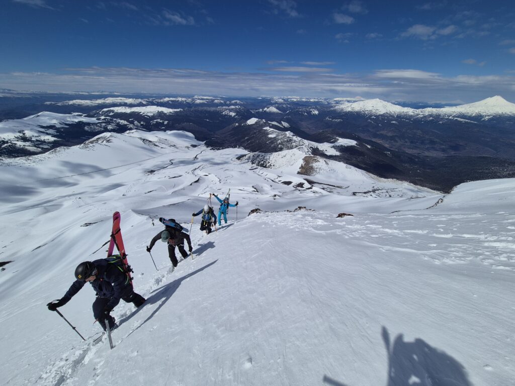 Na platoju pod vršno strmino veter občutno ojača. Predno začnemo s strmim lijakom, ki se izteče na ramo pod južnim vrhom si nadenemo smučarska očala in  zdi se kot, da je nekdo malo priprl okno. Strma prečnica nas pripelje na manjšo ramo od koder je do vrha le še kratka a ledena strmina. Kot na vsakem vrhu, smo si morali tudi tu nadeli dereze in v orkanskem vetru  krenili proti robu kraterja. Na vrh smo morali oditi sklonjeni, tako je pihalo. Drobci ledu so se boleče zaletavali v lica. Vsak si je na svoj način pomagal in prekrival obraz. Na vrhu je bilo še najbolj udobno ležati, le tako smo bili sigurni, da nas ne zabriše po tleh. Roke in objem na zadnjem,  tako željenem vrhu, v tretje! Hitro se odmajemo nazaj proti robu in do depoja s smučmi. Tam piha že manj, toliko, da lahko na hitro pojemo in se pripravimo za spust. Začetna strmina je ravno prav odpustila in da odlično smuko. Kasneje se debelina odpuščene plasti poveča a še vedno v lepi smuki prismučamo nazaj na smučišče. Med dolgo vožnjo nazaj proti Puerto Monttu se oblaki gostijo in v mesto prispemo pozno zvečer, ob močnem dežju. Bi se lahko lepše izšlo?