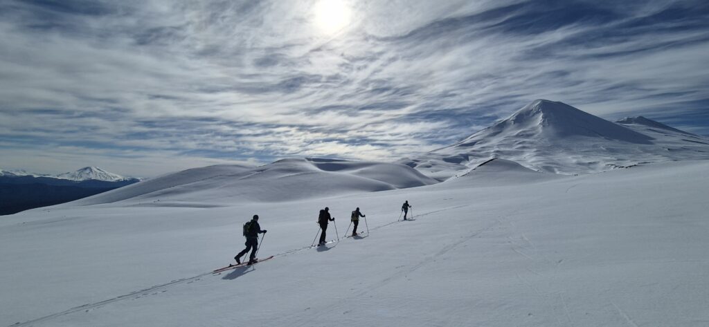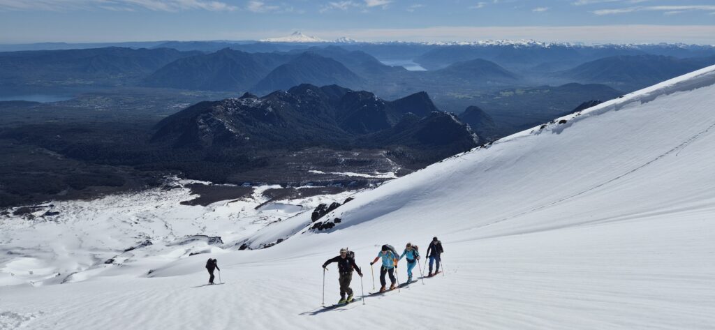 Gledam in poslušam koncert Pink Floydov v Gdansku iz leta 2008 in razmišljam ali je skladba Echoes morda najboljši komad napisan, ever. Ali je to vseeno Rahmaninov koncert za klavir št.2? Ravno se nežno zaključuje pregovarjanje kitare Davida Gilmourja in klaviatur Richarda Wrighta na njegovem zadnjem koncertu, ko me predrami: »…cabin crew sit for landing!« Čez nekaj trenutkov kolesa dokaj grobo udarijo na letališko stezo;  pristanemo v Puerto Monttu, majhnem kraju v Čilu, na severnem robu Patagonije. 24 ur dolgo potovanje nas je preselilo na drugo stran zemlje, iz poletja v zimo. Po 10 letih sem ponovno v tako ljubi Južni Ameriki, komaj verjamem, da je minilo že toliko časa. Pred otroci sem bil tam vsako leto, včasih dvakrat. Tam sem preživel skupaj skoraj dve leti, večinoma s plezalnimi cilji. Tokrat ne nosim s seboj plezalne opreme temveč smuči. Smučat gremo z vulkanov! Želja je bila že dolgo na seznamu, pred več kot petnajstimi  leti sem v šamoniški knjigarni opazil in kupil knjigo Topo de ski andinisme in začwl sanjariti o drugačnem obisku Čila. Pred leti sem že imel nekaj sopotnikov a se ni izšlo. Tokrat smo fina ekipa petih, še Melita, Andrej, Aleš in Matej , pravkar in prav zares pristali v Čilu. Država predstavlja nekakšno hrbtenico Južne Amerike in se kot  ščit vleče preko dveh tretjin kontinenta. Preko cele dežele se vleče tudi najdaljše gorovje na svetu, v celoti preko 3000 km dolgi, Andi. Le ti se poganjajo skoraj 7000 metrov v nebo  a bolj kot se kontinent oži, nižje so tudi gore. Nekje pod 38 vzporednikom se začenjajo najboljše smučarske gore/vulkani Čila in segajo do višine dobrih 3000 metrov. Kar 105 vulkanov se nahaja  tam,  Primat gre  Ojos del Saladu, ki je s 6893 m najvišji delujoči vulkan na svetu, in drugi najvišji vrh zahodne in južne poloble. A njegov glavni problem, gledano s smučarskimi očmi, je pomanjkanje snega, običajno ga ni dovolj  za smučanje. Količina padavin tekom najdaljše gorske verige na svetu, močno variira. V povsem južnem  delu, Patagoniji, je padavin veliko. V srednjem delu kjer se nahajata Ojos del Salado, pa zelo malo. Puščava Atacama, ki leži na zahodu pod gorami, spada celo med najbolj suha področja zemlje, Smučanje torej odpade. Snežno ugodni vrhovi se začenjajo okoli Santiaga, najbolj značilni smučarski vulkani pa še malo južneje, okoli mesta Chillan. Višina tam že močno pade in je turna smuka zato prijetnejša in vetrov manj.