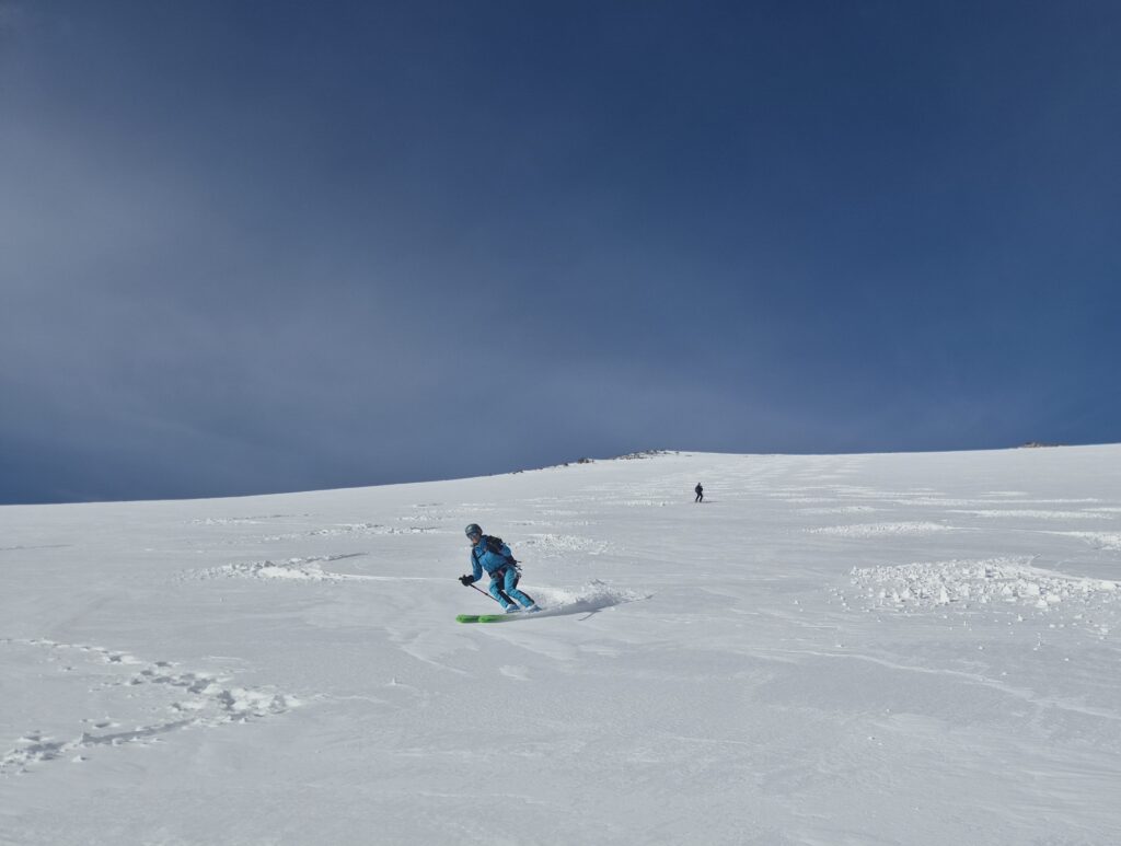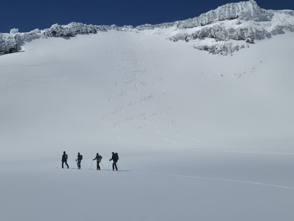 Večina ostalih ljudi z istim ciljem se že takoj preobuje v dereze, mi opravimo še nekaj sto metov na smučeh in se preobujemo na začetku strmejšega dela grebena, ki ga prekinja nekaj skal. Hoja je ugodna in kmalu smo na vrhu Lonquimaya.  Zelo radi bi smučali v njegov krater. Poskusim direktno z vrha a pobočje se izkaže za trdo in ledeno, da robniki ob spodobni naklonini spodrsavajo. Odštamfam nazaj, poskusimo drugje. Kakih 100 metrov naprej opazim možen prehod preko kratkega skalnega pasu. Kar s smučmi na nogah navzdol preštamfamo skalni del do začetka lepe strmine. Sneg tam je  zaščiten in mehak zato se ob idealni smuki spustimo prav do dna kraterja. »A pa luknja na dnu je zasuta?« se glasno sprašujemo, ko malicamo na dnu. Občutek, da počneš nekaj nenavadnega je skupaj z dobro smuko dal prav evforične občutke. Kratek vzpon nazaj na rob in lepa smuka do avta. Tiptop!