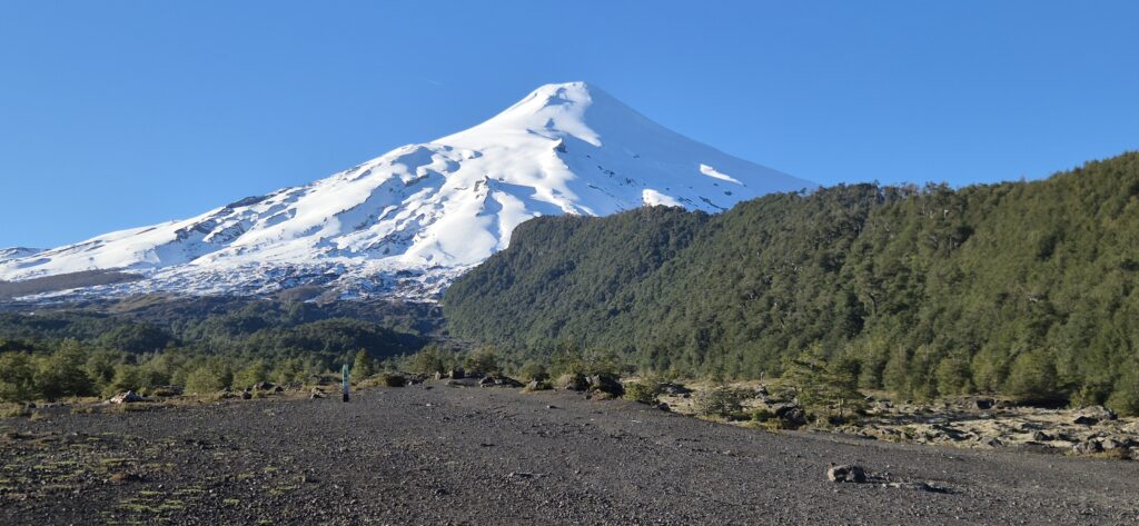 Vulkan Lliama, visok 3128 metrov smo opazovali že včeraj na poti. Zeleno, neskončno obzorje in bela piramidasta gora, kot bi jo narisal majhen otrok. V večerni svetlobi so se prizori zdeli prav nezemski. Vzpon se začne ponovno na majhnem smučišču, ki se poganja iz čudovitega gozda značilnih dreves Araucaria Auracana. Drevo, čilski endemit,  zaradi razširjenosti v prazgodovini in današnje redkosti, imenujejo živeči fosil.